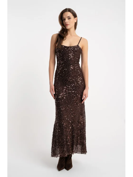 Αυτό το εξαιρετικό μάξι φόρεμα, φτιαγμένο από πλεκτό ύφασμα καλυμμένο με μικροσκοπικές, πυκνά διατεταγμένες πούλιες σε μια βαθιά καφέ απόχρωση, είναι ιδανικό για βραδινές εξόδους και ειδικές περιστάσεις – η παραμονή Πρωτοχρονιάς είναι προ των πυλών!