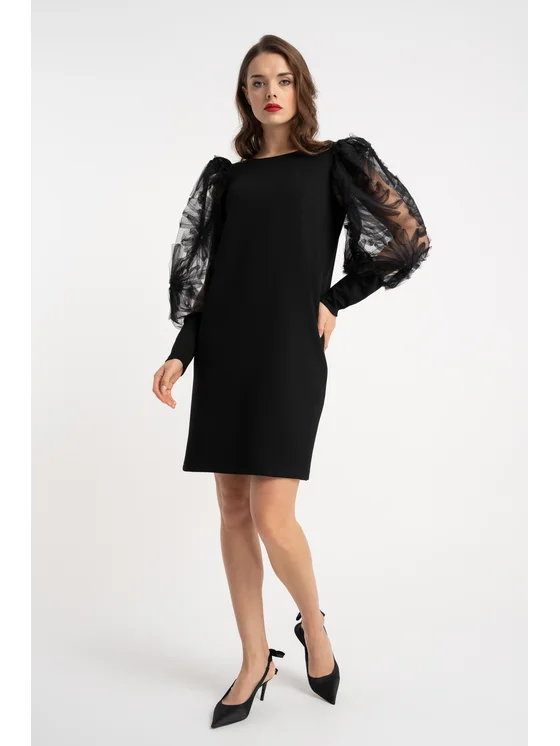 Η απλή σιλουέτα πάνω από το γόνατο με λαιμόκοψη bateau, σε συνδυασμό με τα διαφανή, εντυπωσιακά μανίκια που ολοκληρώνονται με φαρδιές μανσέτες, του δίνει έναν μοναδικό χαρακτήρα, καθιστώντας το την ιδανική επιλογή για μια βραδινή έξοδο.