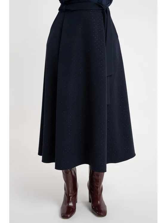 Μια μακριά, φαρδιά φούστα σε σκούρο μπλε.