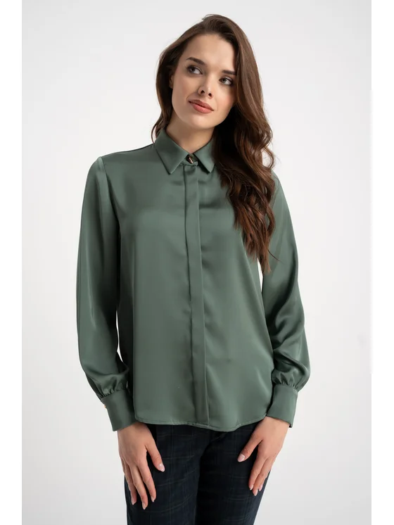 Διαθέτει κλασικό γιακά, κρυφό κλείσιμο με κουμπιά και ελαφρώς φουσκωμένα μανίκια.