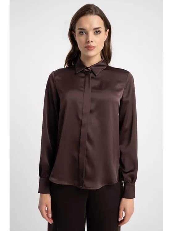 Διαθέτει κλασικό γιακά, κρυφό κλείσιμο με κουμπιά και ελαφρώς φουσκωμένα μανίκια.