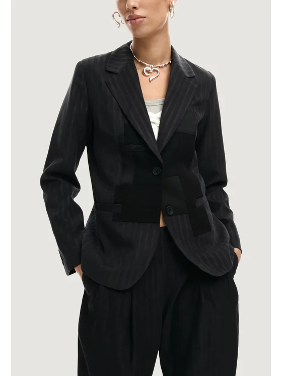 Το γυναικείο σακάκι Desigual AME_CINCINNATI (μοντέλο 26SWEW24) συνδυάζει άψογα την κλασική κομψότητα με το σύγχρονο στυλ. Κατασκευασμένο από 91% πολυεστέρα και 9% πολυαμίδιο, προσφέρει δομημένη αλλά άνετη εφαρμογή. Ο σχεδιασμός του ξεχωρίζει με το διακριτικό ριγέ μοτίβο και τις μοναδικές γεωμετρικές τόνους-στον-τόνο λεπτομέρειες στο μπροστινό μέρος, προσθέτοντας μοντέρνα και εκλεπτυσμένη πινελιά. Διαθέτει κλείσιμο με δύο κουμπιά, κλασικό πέτο και πλαϊνές τσέπες με ρέλι, ιδανικό για επίσημες περιστάσεις ή κομψές casual εμφανίσεις. Ένα ευέλικτο κομμάτι που ολοκληρώνει κάθε σύνολο.