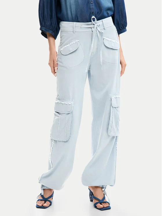 Πρόσθεσε άνεση και χαλαρότητα στην καθημερινή σου γκαρνταρόμπα με το υφασμάτινο παντελόνι από Desigual. Ο ψηλός ποδός τονίζει τη σιλουέτα, προσφέροντας άνεση καθ' όλη τη διάρκεια της ημέρας, ενώ τα ίσια μπατζάκια που τελειώνουν με ελαστικά τελειώματα και κορδόνια εγγυώνται εξαιρετική εφαρμογή. Το μοντέλο είναι κατασκευασμένο από συνδυασμό αεριζόμενου βαμβακιού και απαλής βισκόζης, γεγονός που καθιστά το παντελόνι όχι μόνο ευχάριστο στην αφή αλλά και πρακτικό για καθημερινή χρήση. Λειτουργικές λεπτομέρειες, όπως φερμουάρ και ευρύχωρες τσέπες με καπάκια, προσθέτουν χαρακτήρα και ευελιξία.