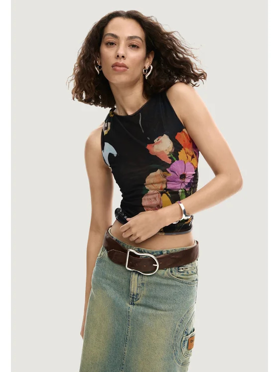 Το γυναικείο αμάνικο μπλουζάκι Desigual TS_BRUSELAS 26SWTK14 ξεχωρίζει για το ζωντανό και πρωτότυπο στυλ του, χαρακτηριστικό της μάρκας. Κατασκευασμένο από 93% πολυεστέρα και 7% ελαστάνη/λύκρα, προσφέρει εφαρμοστή και άνετη γραμμή που αναδεικνύει τη σιλουέτα. Το ελαστικό ύφασμα εξασφαλίζει ελευθερία κινήσεων και ευχάριστη αίσθηση στο δέρμα. Το καλλιτεχνικό φλοράλ μοτίβο προσδίδει θηλυκή και μοντέρνα πινελιά, ιδανική για casual εμφανίσεις ή για να δώσετε προσωπικότητα στα καλοκαιρινά σας σύνολα. Ταιριάζει τέλεια με φούστες ή τζιν για φρέσκο και κομψό στυλ.
