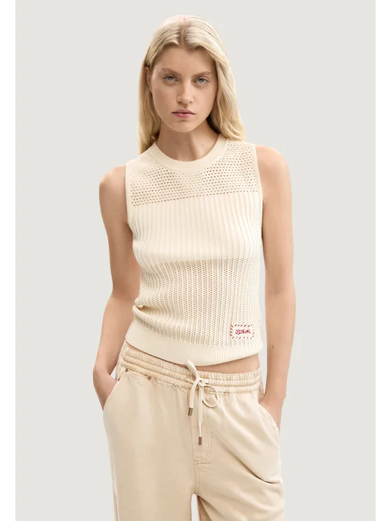 Το γυναικείο αμάνικο μπλουζάκι Desigual TS_ROMA (μοντέλο 26SWTF02) αποτελεί ιδανική επιλογή για όσες αναζητούν ένα ευέλικτο και μοντέρνο κομμάτι. Κατασκευασμένο από 81% βαμβάκι και 19% πολυαμίδιο, προσφέρει άνεση και δροσιά καθ’ όλη τη διάρκεια της ημέρας. Το αμάνικο σχέδιο αναδεικνύει τη σιλουέτα, ενώ το πλεκτό ύφασμα με ριγέ υφή και διακοσμητικές λεπτομέρειες προσθέτει μια σύγχρονη και πρωτότυπη πινελιά. Ιδανικό για συνδυασμό με τζιν ή φούστα, ταιριάζει τόσο σε casual όσο και σε πιο κομψές εμφανίσεις, αποτελώντας απαραίτητο κομμάτι για τη ζεστή περίοδο.