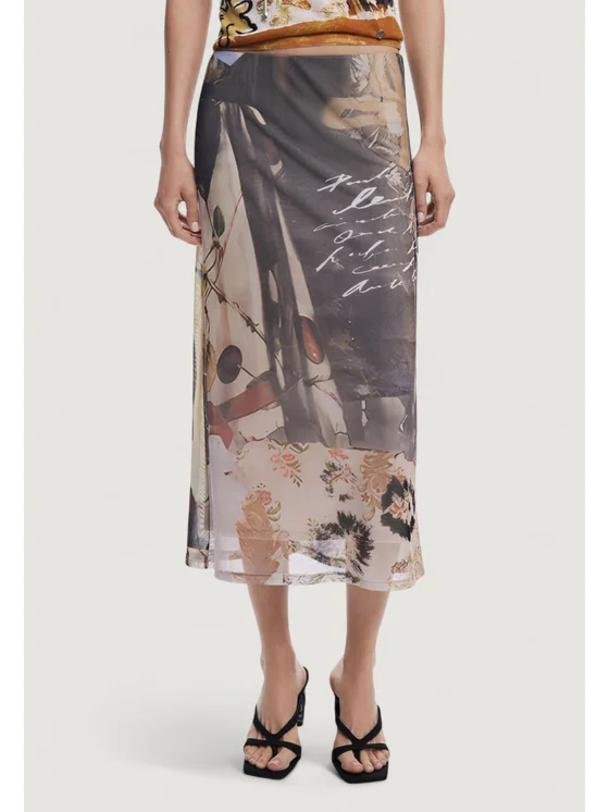 Η φούστα longuette FAL_COLLAGE της Desigual (μοντέλο 25WWFK05) είναι ένα θηλυκό ρούχο με μοναδικό χαρακτήρα, ιδανικό για όσες θέλουν να ξεχωρίζουν με στυλ. Κατασκευασμένη από ένα άνετο μείγμα από 94% πολυεστέρα και 6% ελαστάν/lycra, αυτή η φούστα προσαρμόζεται απαλά στη σιλουέτα, προσφέροντας άνετη και ευέλικτη εφαρμογή. Ο σχεδιασμός της χαρακτηρίζεται από ένα καλλιτεχνικό σχέδιο κολάζ που συνδυάζει γραφικά στοιχεία, γράμματα και φλοράλ μοτίβα, δημιουργώντας ένα πρωτότυπο και μοντέρνο οπτικό αποτέλεσμα. Το μήκος midi την καθιστά ευέλικτη, ιδανική τόσο για casual όσο και για πιο κομψά σύνολα. Ένα εμβληματικό ρούχο από τη συλλογή Desigual, σχεδιασμένο για όσες αγαπούν τη δημιουργική και σύγχρονη μόδα.