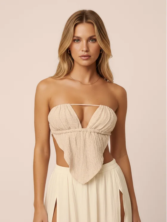 Το μοντέλο δένεται πίσω με λεπτά κορδόνια – αφήνει την πλάτη γυμνή και αναδεικνύει όμορφα τη σιλουέτα. Μπροστά, οι χαρακτηριστικές πιέτες σχηματίζουν τρίγωνο, τονίζοντας διακριτικά το στήθος και χαρίζοντας ελαφρότητα σε boho ύφος.