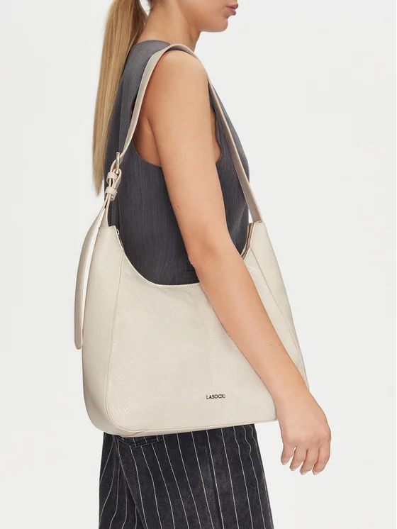 Κομψή τσάντα της μάρκας Lasocki σε κρεμ απόχρωση είναι η επιτομή του στιλ και της λειτουργικότητας. Κατασκευασμένη από υφασμάτινο υλικό, χαρακτηρίζεται από στιβαρή κατασκευή, που εξασφαλίζει ανθεκτικότητα και αισθητική εμφάνιση για μεγάλο χρονικό διάστημα. Ιδανική για τον ώμο, προσφέρει άνεση στη χρήση, και χάρη στο κλείσιμο με φερμουάρ, όλα τα αντικείμενα που φυλάσσονται είναι ασφαλή. Πρακτικές θηκούλες στο εσωτερικό της τσάντας χρησιμεύουν για την αποθήκευση πορτοφολιού και τηλεφώνου, επιτρέποντας τη διατήρηση της τάξης. Η τσάντα Lasocki είναι ένα στιλάτο αξεσουάρ που συμπληρώνει τέλεια κάθε γυναικεία γκαρνταρόμπα.